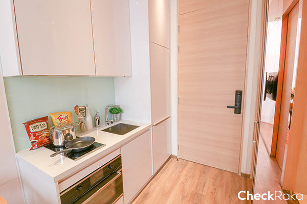 ห้องพักอาศัยของโครงการนี้จะเน้นไปที่ 1 ห้องนอน ให้พร้อมเฟอร์นิเจอร์แบบ Fully Fitted ให้ชุดครัวแบบพรีเมี่ยม เตาไฟฟ้า และไมโครเวฟ ยี่ห้อ Kuppersbusch พร้อมครื่องดูดควัน ก๊อกน้ำ อ่างล้างจาน และตู้เย็นแบบบิวท์อินยี่ห้อ Teka นอกจากนั้นยังมีตู้เสื้อผ้าและโถสุขภัณฑ์แบบอัตโนมัติอีกด้วย และวันนี้จะไปชมห้องแบบ 1 ห้องนอน 2 ขนาดกันค่ะ คือ Size S และ L