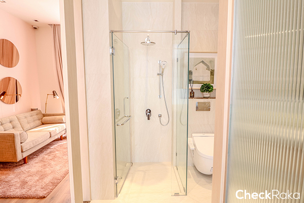 แยกส่วนเปียกส่วนแห้งด้วย Shower Box กระจกนิรภัย ด้านในมีฝักบัว และ Rain Shower ส่วนสุขภัณฑ์จะเป็นของ Toto