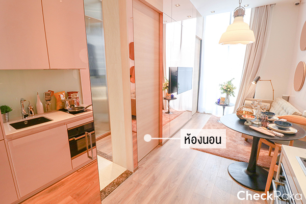 มุมนี้จะมองจากประตูที่เข้าจากทางครัว ทำให้ได้ความเป็นส่วนตัวตรงที่แขกมาก็จะไม่เข้าไปเห็นห้องนอนโดยตรง