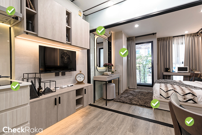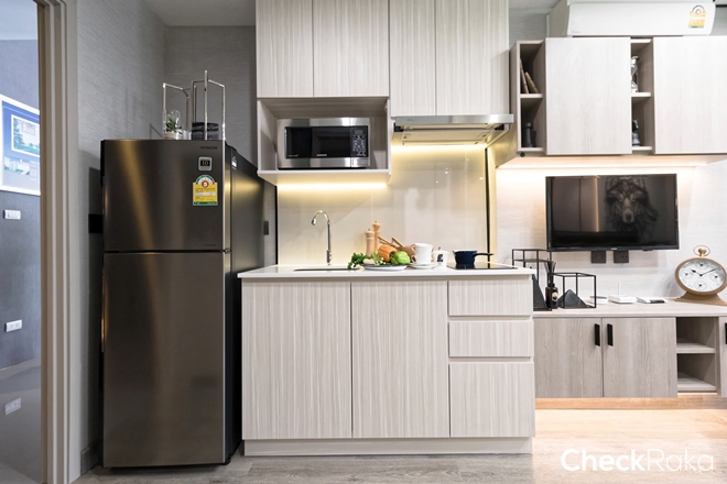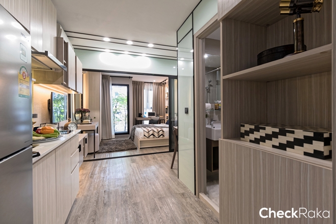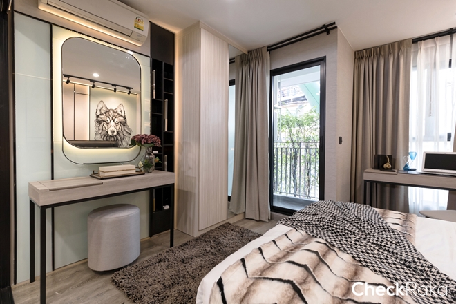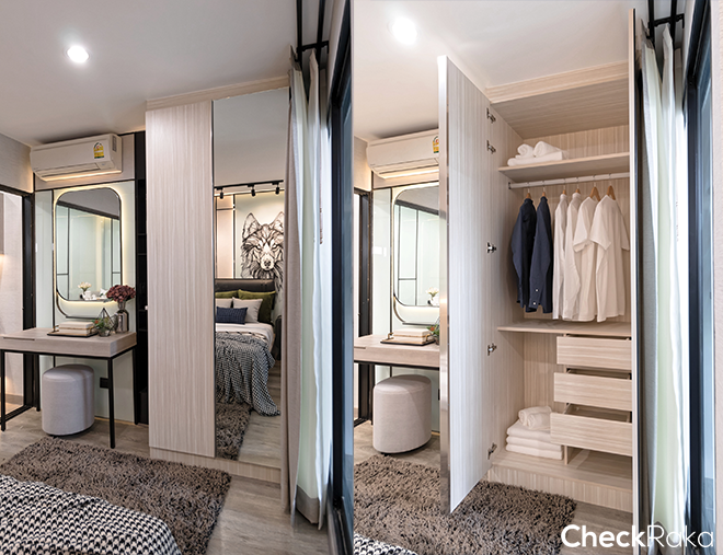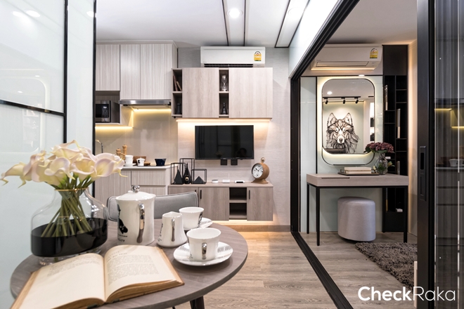 ห้องพักอาศัยของโครงการนี้แบ่งออกเป็น 2 รูปแบบ ได้แก่ 1 Bedroom ขนาด 26 - 28 ตร.ม. และ 1 Bedroom Plus ขนาด 39 - 40 ตร.ม. การออกแบบ Layout ห้องส่วนใหญ่ให้ความสำคัญกับห้องนอนและห้องนั่งเล่น ห้องที่เป็น 1 Bedroom จะได้ครัวแบบเปิด วางอยู่ติดประตูทางเข้าห้อง ส่วนห้อง 1 Bedroom Plus จะได้ครัวแบบเปิดวางอยู่ติดกับพื้นที่ระเบียง โครงการนี้ขายห้องพร้อมเฟอร์นิเจอร์ วัสดุภายในห้องให้คุณภาพดีมากเมื่อเทียบกับราคาขาย ส่วนใหญ่ได้วัสดุเทียบเท่าแบรนด์เจ้าใหญ่ๆ เดี่ยวพาไปดูกันทีละจุดเลยค่ะ