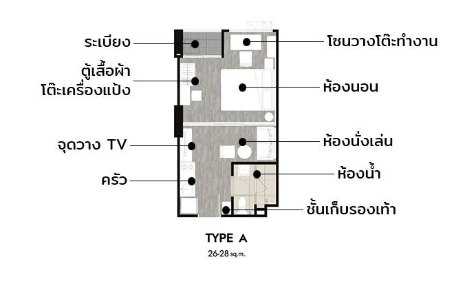 ห้องตัวอย่างของโครงการ แบบ 1 Bedroom ขนาด 26 ตร.ม. (ราคาเริ่มต้น 1.69 ล้านบาท*)