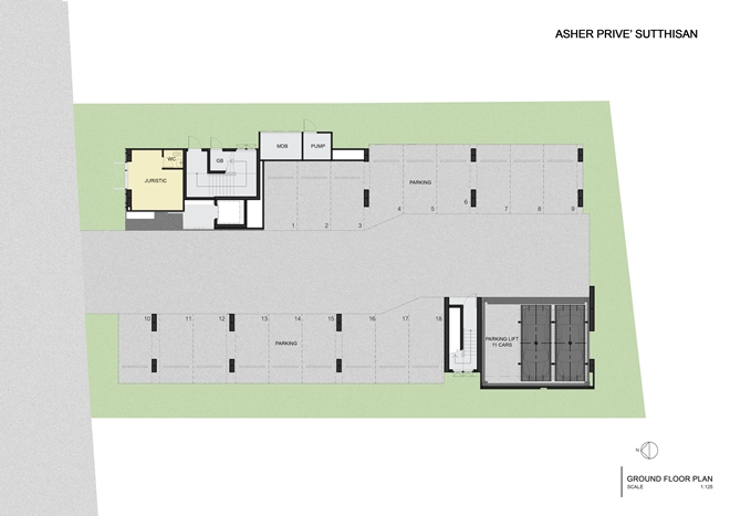 แปลนชั้น 1 มีทั้งจุดจอดรถแบบธรรมดา 18 คัน และจุดจอดรถแบบ Auto Parking รวมพื้นที่จอดรถประมาณ 40%