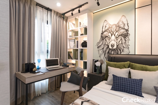 พื้นที่ด้านข้างเตียงนอนยังมีเหลือให้เดินผ่านได้ทั้ง 2 ฝั่ง ด้านขวาเป็นมุมที่เราจัดเป็นพื้นที่วางโต๊ะทำงานได้เลย