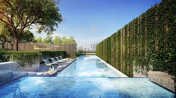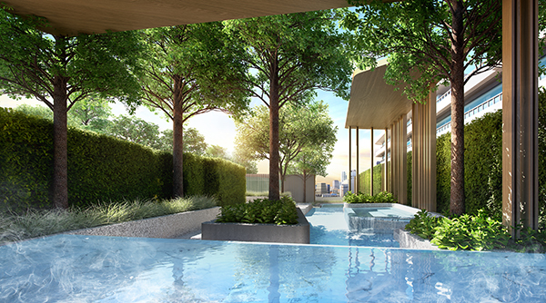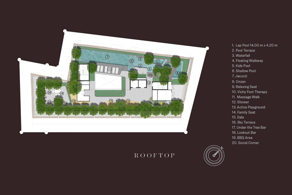 14.00 m. x 4.20 m. Swimming pool Pool Terrace Waterfall Floating walkway Kids pool Shallow Pool Jacuzzi Onzen Relaxing seat Vichy foot therapy Massage walk Shower Active Playground ทางเข้าโครงการที่ต่ำลงมากว่าระดับพื้นปกติ 1.9 เมตร เพื่อความเป็นส่วนตัว