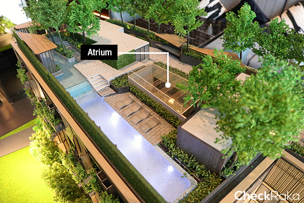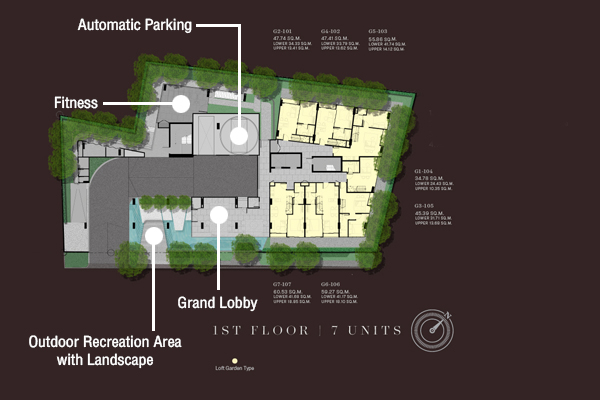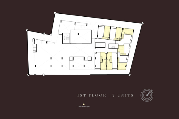 Atrium ให้แสงธรรมชาติสาดส่องเข้ามาภายในตัวอาคาร พร้อมพื้นที่นั่งเล่นที่ชั้น 2 Floor Plan ชั้น 1 : มียูนิตพักอาศัยแบบ Loft 7 ยูนิต