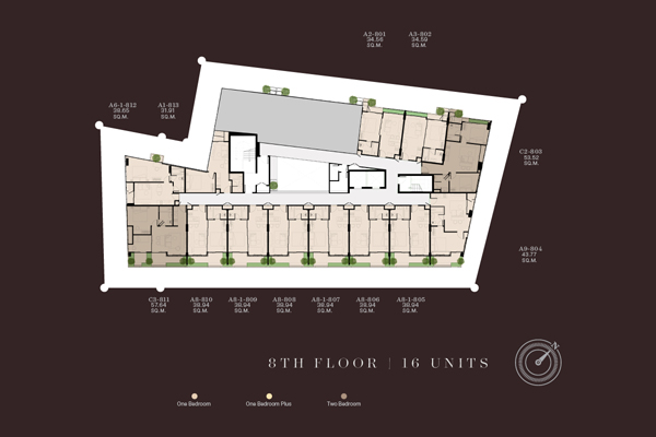 Floor Plan ชั้น 1 : ชั้นนี้จะลดระดับลงไปประมาณ 1.9 เมตร จากแนวพื้นดินปกติ เพื่อความเป็นส่วนตัว Floor Plan ชั้น 2 : ยูนิตพักอาศัยจำนวน 16 ยูนิต Floor Plan ชั้น 3 : ยูนิตพักอาศัยจำนวน 16 ยูนิต Floor Plan ชั้น 4 : ยูนิตพักอาศัยจำนวน 16 ยูนิต Floor Plan ชั้น 5 : ยูนิตพักอาศัยจำนวน 16 ยูนิต Floor Plan ชั้น 6 : ยูนิตพักอาศัยจำนวน 16 ยูนิต Floor Plan ชั้น 7 : ยูนิตพักอาศัยจำนวน 16 ยูนิต Floor Plan ชั้น 8 : ยูนิตพักอาศัยจำนวน 13 ยูนิต จะเว้นช่วงสระว่ายน้ำที่อยู่ชั้นบนเอาไว้ Rooftop Plan