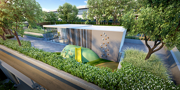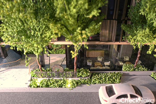 ส่วนกลางเน้นความเป็นส่วนตัวและใกล้ชิดธรรมชาติ ส่วนตัวตรงที่ยูนิตน้อยและพื้นที่ชั้น 1 ลดระดับลงไปประมาณ 1.9 เมตร จากแนวพื้นดินปกติ ทำให้คนด้านนอกไม่เห็นกิจกรรมภายในโครงการ และยังมอบความสะดวกให้กับลูกบ้านด้วยระบบจอดรถแบบอัตโนมัติ (Automatic Parking) จำนวน 57 คัน