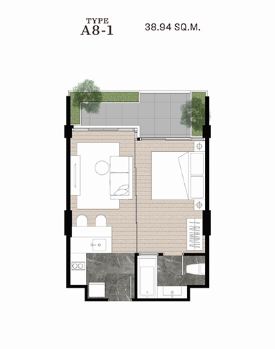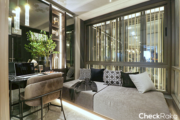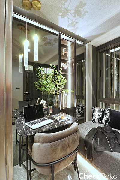 ภายในห้องจะได้โซฟาเบด หรืออาจจะปรับเป็นห้องทำงาน ห้องสมุด หรือห้องนอนอีกห้องก็ได้ ด้านนอกจะติดตั้ง