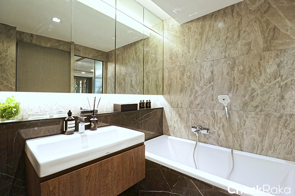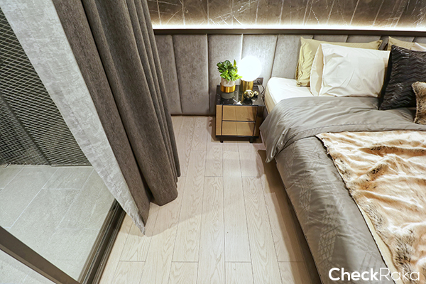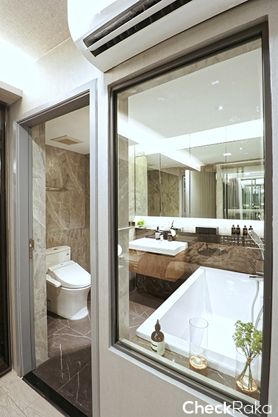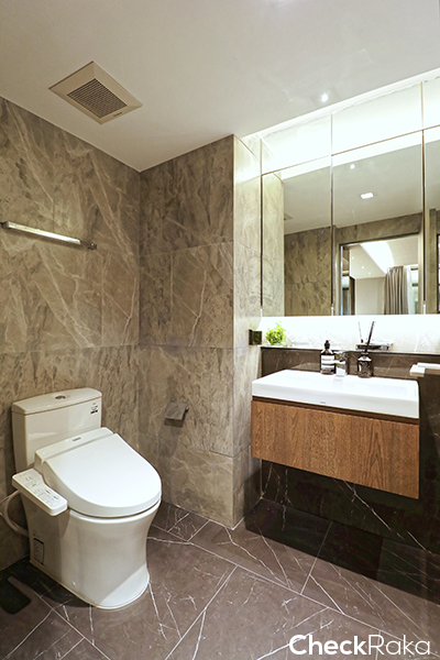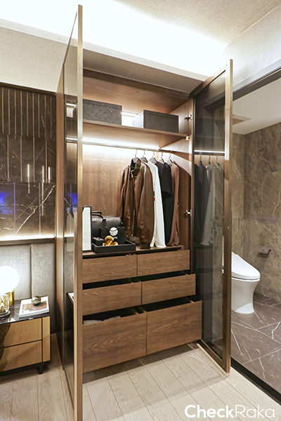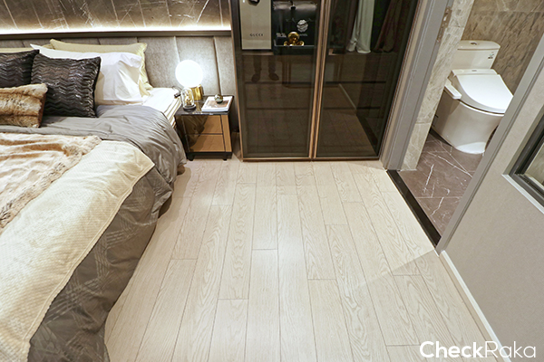 พื้นที่ค่อนข้างกว้างสำหรับแต่งตัว พื้นในห้องนอนเป็น Engineering Wood ตู้ที่ได้ดีไซน์สวยงาม ฟังก์ชันก็ครบมีลิ้นชักเยอะมากๆ ทุกยูนิตเป็น Sexy Bathroom