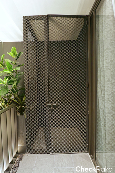 เปิดประตูบานเลื่อนออกไปจะเป็นพื้นที่ระเบียง พื้นเป็นแกรนิตโต้ มีรั้วเหล็กกันตกให้สูงประมาณ 1 เมตร