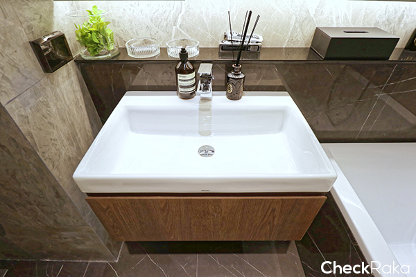 Top ชั้นวางของเป็นหินอ่อน อ่างล้างหน้ามีที่เก็บของด้านล่างด้วยค่ะ