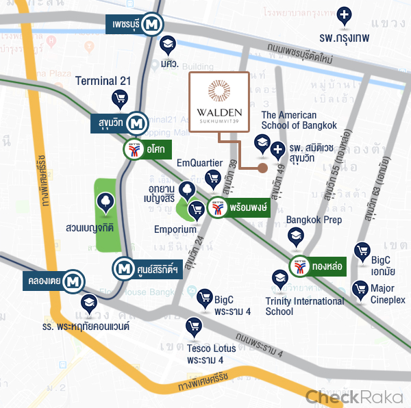 เจ้าของและผู้พัฒนาโครงการ : บริษัท ฮาบิแทท กรุ๊ป จำกัด ที่ตั้งโครงการ : ซอยสุขุมวิท 39 / ซอยสุขุมวิท 49/1 แขวงคลองตันเหนือ เขตวัฒนา กรุงเทพมหานคร 10110 อาคารชุดพักอาศัย : 1 อาคารสูง 8 ชั้น จำนวน 116 ยูนิต ขนาดที่ดินทั้งโครงการ : 0-3-22 ไร่ ลิฟต์โดยสาร 2 ตัว ห้องชุด : มี 5 แบบหลักๆ ได้แก่ - 1 bedroom : 31 - 43 ตร.ม. - 1 bedroom plus : 40 - 45 ตร.ม. - 1 bedroom loft : 34 ตร.ม. - 2 bedroom : 53 - 59 ตร.ม. - 2 bedroom loft : 45 - 60 ตร.ม. ราคาเริ่มต้น : 5.9 ล้านบาท* (ข้อมูล ณ 31 ต.ค. 61) วันที่เข้าเยี่ยมชม - รีวิวคอนโด : 31 ต.ค. 61 วาลเด้น สุขุมวิท 39 ตั้งอยู่ที่ซอยสุขุมวิท 49/1 แขวงคลองตันเหนือ เขตวัฒนา กรุงเทพมหานคร 10110 ใกล้กับ BTS พร้อมพงษ์ประมาณ 800 เมตร ซึ่งย่าน "พร้อมพงษ์ " เป็นย่านเศรษฐกิจที่สำคัญของประเทศไทย และอยู่ใน Mid Sukhumvit ที่ประกอบไปด้วย อโศก พร้อมพงษ์ ทองหล่อ ที่เป็นที่อยู่อาศัยของชาวต่างชาติ และยังได้รับการขนานนามว่า "Japanese Town" ยิ่งตอกย้ำข้อมูลที่ว่ามีชาวญี่ปุ่นประมาณ 250,000 คน หรือ 100,000 ครอบครัวที่อาศัยอยู่ในย่านนี้ นอกจากนั้นยังอยู่ไม่ไกลจากห้างสรรพสินค้า โรงพยาบาล และโรงเรียนชั้นนำ