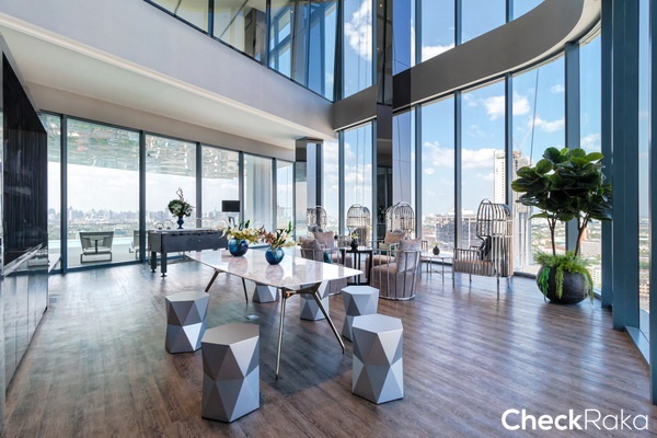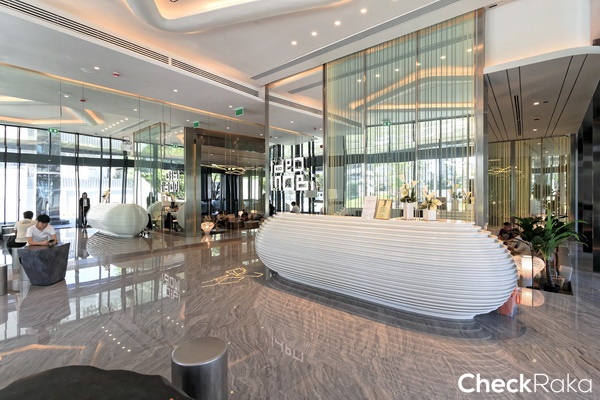 ออกจากลิฟต์มาทางขวาจะเป็น Sky Lounge แบบ Double Volume เพดานสูงมากตกแต่งด้วยกระจกบานสูง
