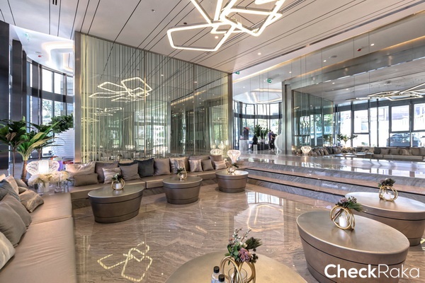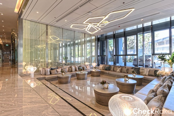 ล็อบบี้เพดานสูงโปร่งตกแต่งด้วยกระจกรอบด้าน ปูพื้นลายหินอ่อน โดยรวมทำออกมาได้