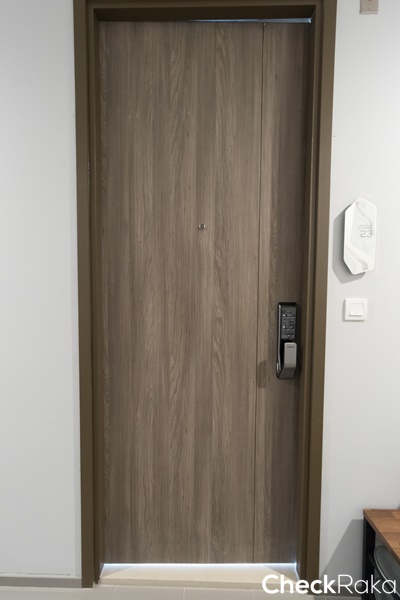ประตูสำเร็จรูปบานใหญ่ วัสดุ HDF Solid Core กรุลามิเนต ขนาด 90x240 ซม. พร้อมแถบยางลดเสียง และอุปกรณ์โช้คอัพ ได้ช่องมองตาแมว พร้อม Digital Door Lock ของ Samsung รองรับ 3 ระบบทั้ง Key card, Password และกุญแจ
