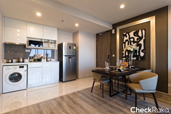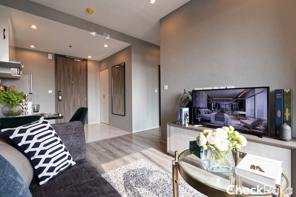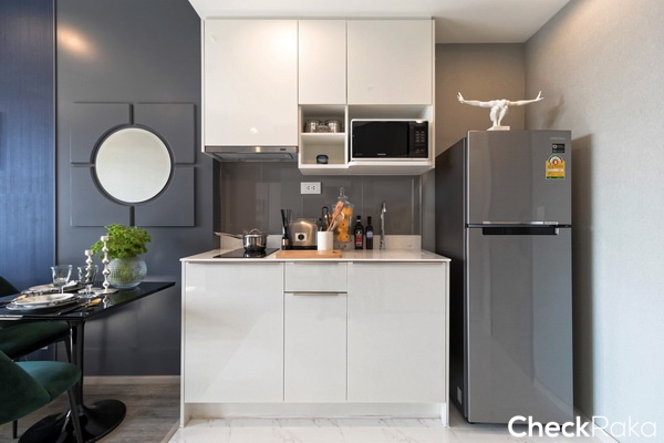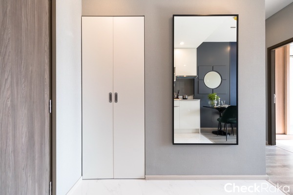 เปิดเข้ามาจะเป็นโซนห้องครัววางเชื่อมต่อกับห้องนั่งเล่น และระเบียง
