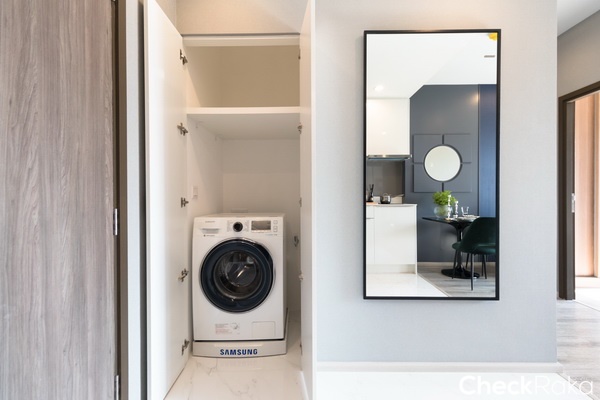 ฝั่งตรงข้ามเคาน์เตอร์ครัวทางโครงการ Built-in เป็นตู้บานเปิดสำหรับเก็บเครื่องซักผ้ามาให้