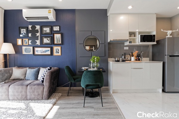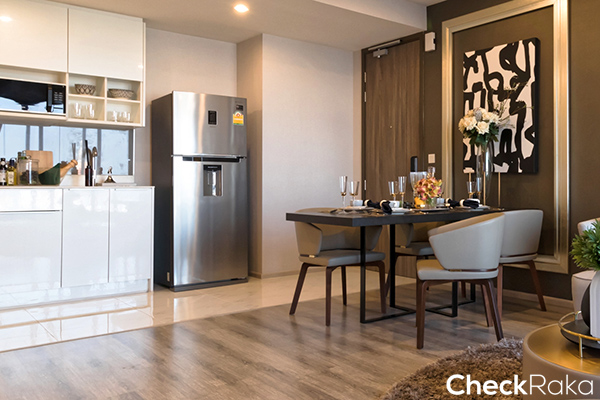 หากวางโต๊ะทานอาหารมาไว้ที่มุมนี้ก็จะช่วยเพิ่มพื้นที่สำหรับเตรียมอาหาร หรือถ้าหากย้ายโต๊ะทานอาหารไปไว้ตรงกระจกเงา ก็จะทำให้ห้องนั่งเล่นเหลือพื้นที่ว่างมากยิ่งขึ้น
