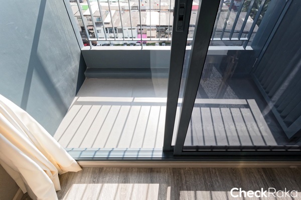 ประตูระเบียงทั้งด้านใน และด้านนอกเป็นกระจกบานเลื่อน 3 ตอน กรอบอะลูมิเนียม