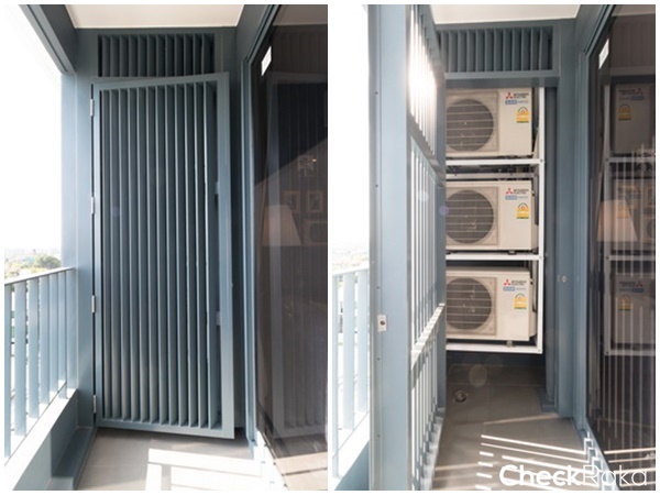คอมเพรสเซอร์แอร์ตั้งอยู่ด้านขวา มีประตูระแนงบังสายตามาให้สูงจรดฝ้า