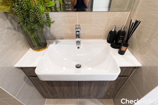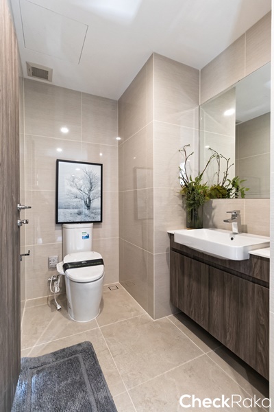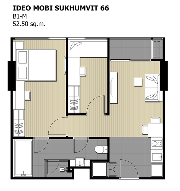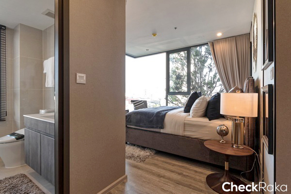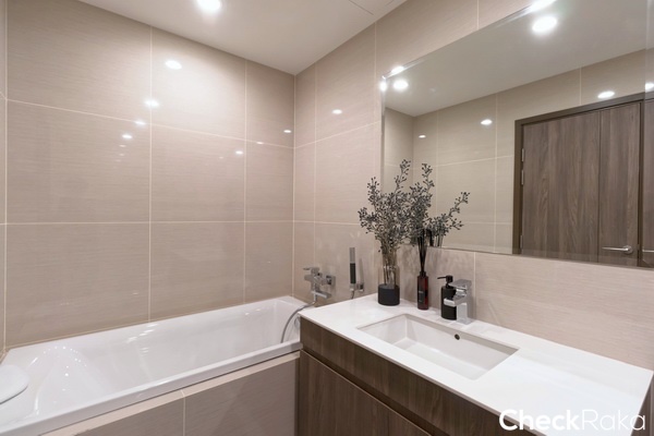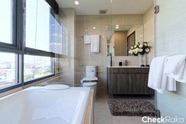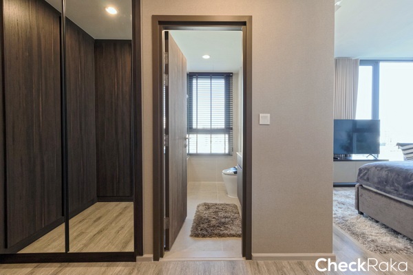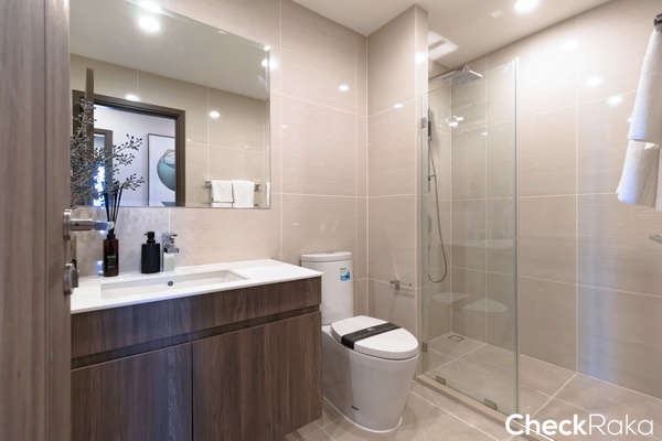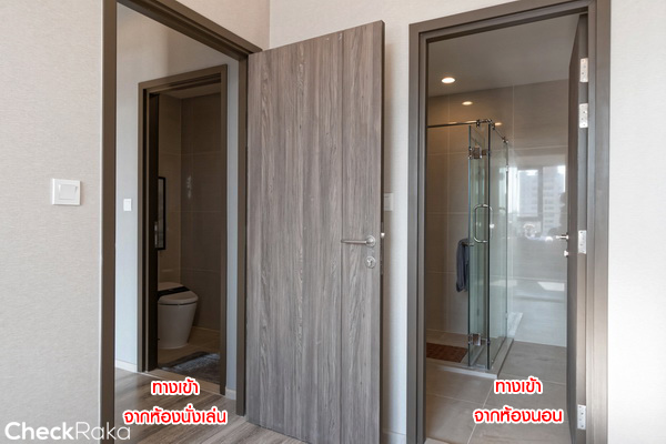 ถึงแม้ห้อง Type นี้จะมีห้องน้ำเพียงห้องเดียว แต่เค้าจัดวาง Layout เป็นรูปตัว I วางยาวเชื่อมต่อกันระหว่างห้องนอนกับโซนห้องนั่งเล่น เป็นห้องน้ำแบบ Double Access เข้าออกได้ 2 ทาง ทั้งจากห้องนอนและห้องนั่งเล่น