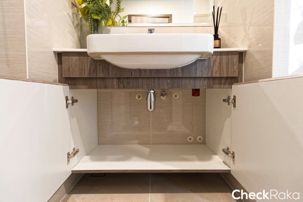 ด้านล่างมีลิ้นชัก 1 ช่อง และตู้เก็บของบานเปิดอีก 3 บาน มีถังขยะมาให้ด้วย บานตู้ทั้งหมดเป็นแบบ Soft Close