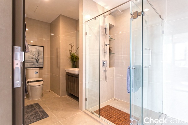 โซนอาบน้ำได้ฉากกันอาบน้ำกระจกเทมเปอร์ แบบผลักเข้าด้านใน ตัวจับถนัดมือ ยกธรณีสูงประมาณ 3 ซม.