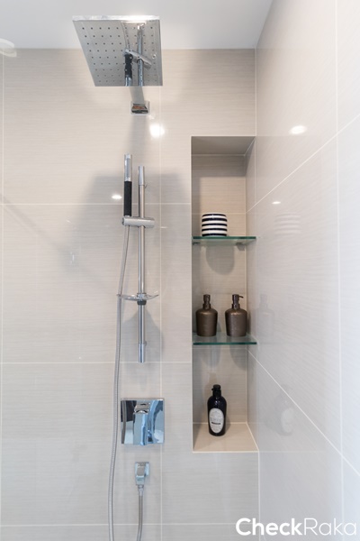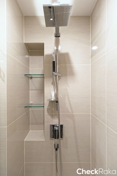 พร้อม Rain Shower ทรงสี่เหลี่ยมของ Kohler ที่ผนังเจาะเป็นช่องสำหรับวางอุปกรณ์อาบน้ำ