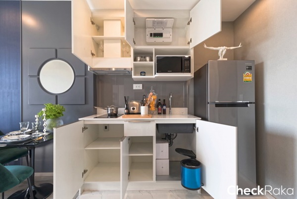 มีช่องเก็บของด้านบน 2 ช่อง, ตู้บานเปิด 3 บาน และช่องวางไมโครเวฟด้านบน