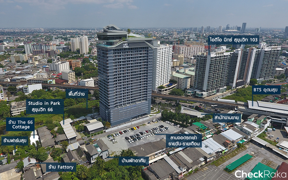 ทิศตะวันออก : ฝั่งด้านหน้าโครงการติดถนนสุขุมวิท ฝั่งตรงข้ามเป็นคอนโดสูง 21-25 ชั้น ได้วิวฝั่งอุดมสุขทิศใต้ : ติดกับซอยสุขุมวิท 66 ปากซอยเป็นสำนักงานขาย ถัดมาเป็นพื้นที่ให้เช่าสำหรับจอดรถรายวัน-รายเดือน บ้านพักอาศัย และร้านอาหาร ทิศนี้ได้วิวฝั่งบางนา ทิศตะวันตก : ด้านหลังโครงการติดกับ Studio in park ความสูงประมาณ 2 ชั้น ถัดมาเป็นบ้านพักอาศัย และร้านอาหาร ทิศนี้จะได้วิวแม่น้ำเจ้าพระยา และบางกะเจ้าด้วยทิศเหนือ : ติดกับที่ดินเปล่าขนาดใหญ่ ทิศนี้จะได้วิวฝั่งอ่อนนุช