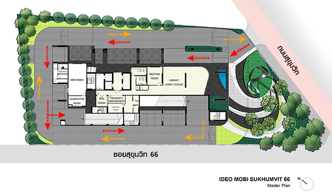 การเดินรถในโครงการ ขาเข้า (ลูกศรสีแดง) จากประตูทางเข้าด้านหน้าขับตรงเข้ามาวิ่งวนทางฝั่งทิศเหนือไปยังทางขึ้นที่จอดรถ ซึ่งจะอยู่ด้านหลังของตัวอาคาร ส่วนขาออก (ลูกศรสีส้ม) ทางลงที่จอดรถจะอยู่ทางฝั่งทิศใต้ของอาคาร จะเป็นทางบังคับเลี้ยวขวาวิ่งวนตามเข็มนาฬิกาเพื่อมายังด้านหน้าของโครงการ