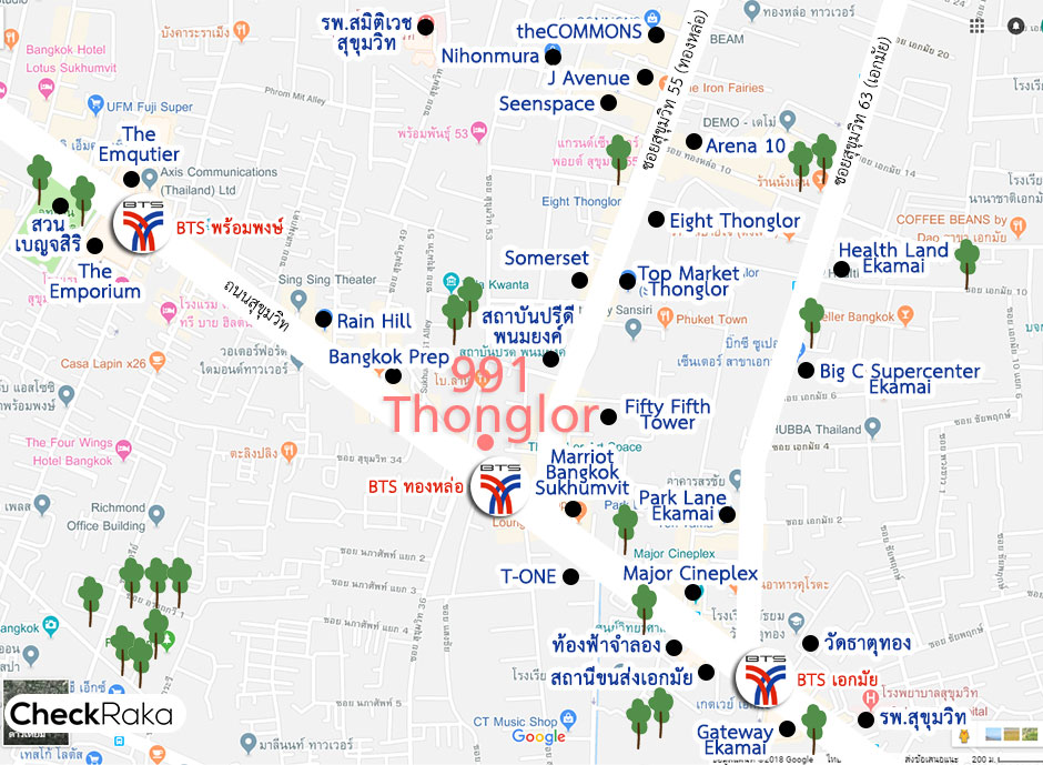 991 ทองหล่อ (991 Thonglor) ตั้งอยู่ริมถนนสุขุมวิท ติดรถไฟฟ้า BTS สถานีทองหล่อ ไม่ไกลจากย่าน Hangout อย่างทองหล่อ ครบทั้งโรงเรียน โรงพยาบาล และยังเดินทางสะดวก สามารถใช้ถนนสุขุมวิทเชื่อมไปถนนพระราม 4 ได้