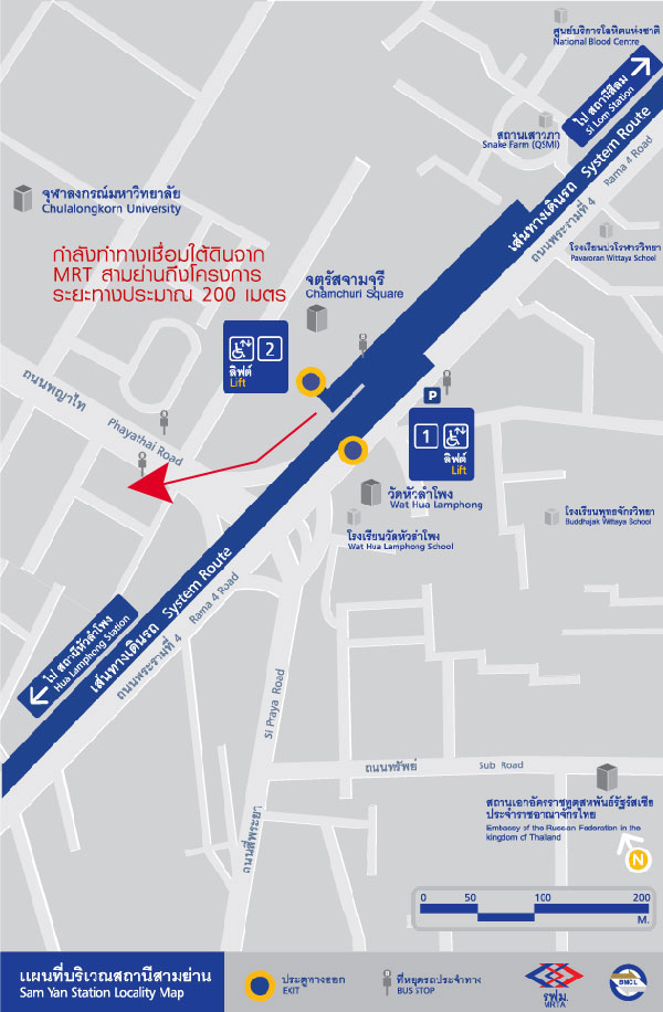 ถ้าเดินออกทาง Exit 2 จะเจอ Site ก่อสร้างทำอุโมงค์ทางเดินเชื่อมต่อ MRT สถานีสามย่านไปยังโครงการสามย่านมิตรทาวน์ เส้นทางเดินใต้ดินจะเป็นประมาณลูกศรแดงในรูปครับ (ระยะทางประมาณ 200 เมตร)