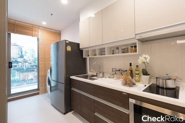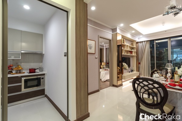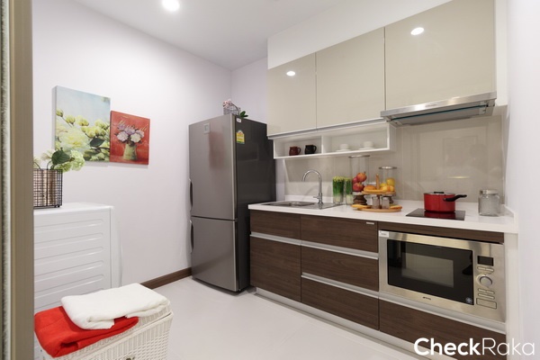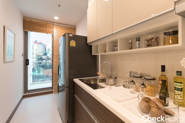 ถัดมาเป็นห้องครัวแบบครัวปิด แต่ลักษณะ Layout ของห้อง Type นี้จะเป็นแนวยาวลึกกว่าห้องที่แล้ว เหมาะสำหรับผู้ที่ชื่นชอบการทำอาหารหนักๆ สามารถเปิดประตูที่ระเบียงเพื่อช่วยระบายกลิ่นระหว่างทำอาหารได้