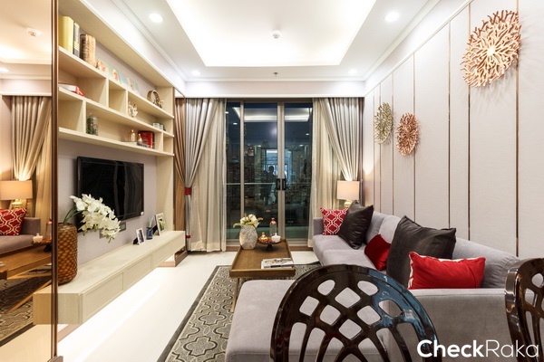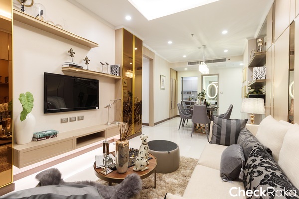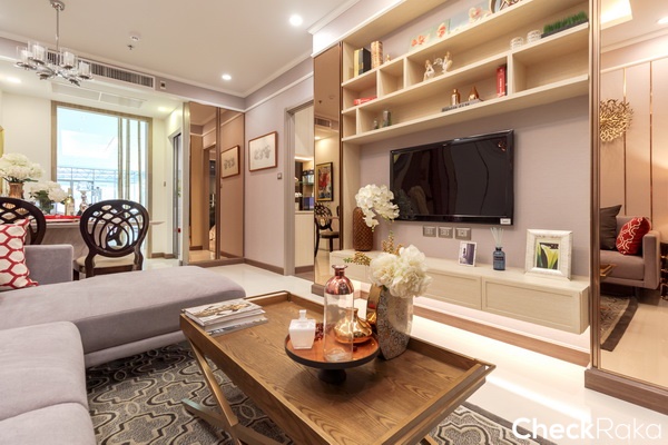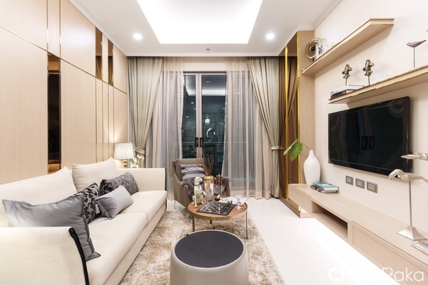 ทางโครงการ Built-in ชั้นวางทีวี และตู้เก็บของมาให้ดูเป็นไอเดีย ตกแต่งมาในโทนสีครีม-ทอง ให้ความรู้สึกหรูหรา