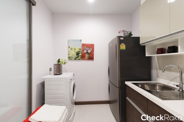 ฝั่งตรงข้ามตู้เย็นวางเป็นพื้นที่วางเครื่องซักผ้า ทางโครงการเดินระบบน้ำดีน้ำทิ้งไว้ให้ที่มุมนี้ พร้อมปลั๊กไฟ