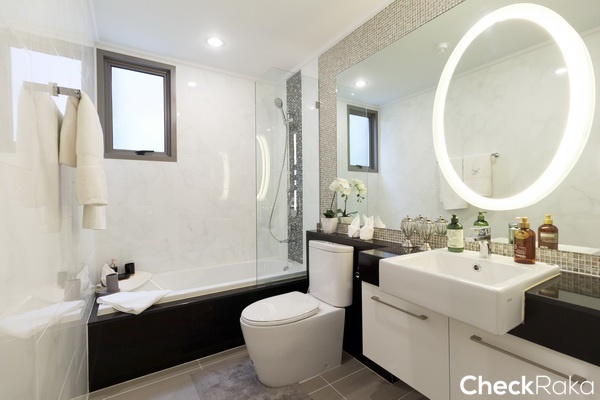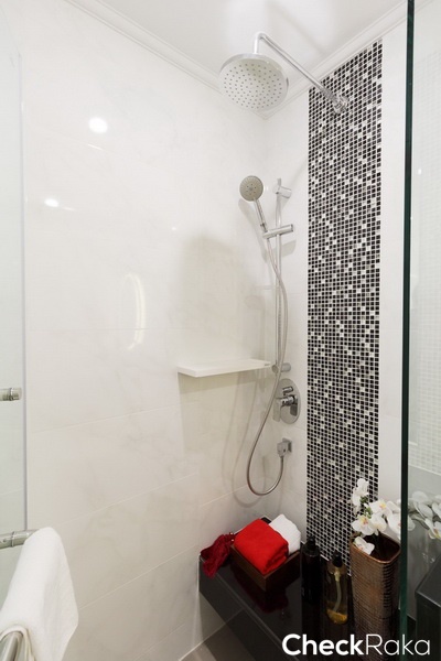 ผนังห้องน้ำลายหินอ่อนโทนสีขาว-เทา บางส่วนเป็นโมเสคโทนสีเข้ม