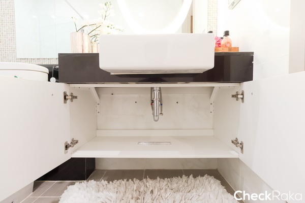 ใต้อ่างล้างหน้ามีตู้เก็บของ ทางโครงการติดตั้งเครื่องทำน้ำร้อนไว้ให้