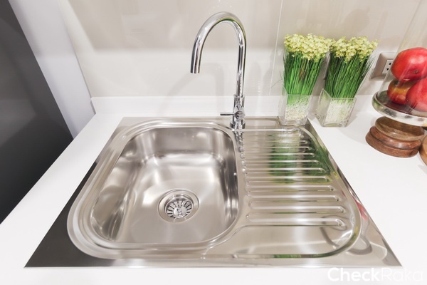 ได้อ่างล้างจานเป็นอ่างสแตนเลส 1 หลุม ไม่มีที่พักจาน พร้อมก๊อกน้ำโครเมี่ยมหัวโค้งของ Mex