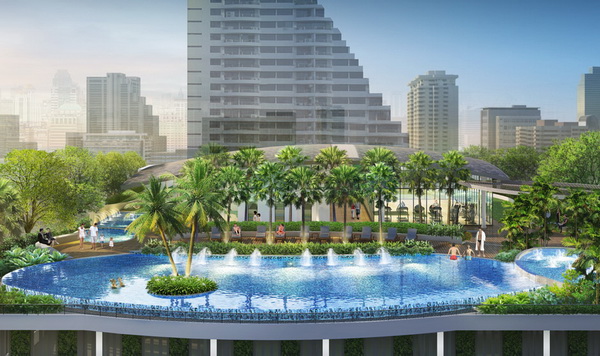 ภาพจำลองบรรยากาศล้อมรอบด้วยสระว่ายน้ำ มีเตียง Day bed ให้นั่งเล่นริมสระ