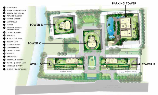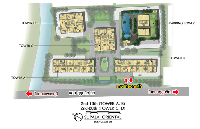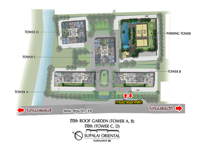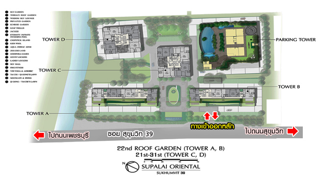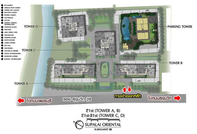 Lobby แยกกันแต่ละอาคาร Fitness พื้นที่ประมาณ 92 ตร.ม. สระว่ายน้ำระบบเกลือแบบ Infinity-Edge & Jacuzzi ขนาด 37x11 เมตร ลึก 1.1 เมตร สระเด็ก ลึก 60 ซม. Sauna Game Room (Snooker) พื้นที่ประมาณ 48 ตร.ม. Aerobic & Yoga พื้นที่ประมาณ 45 ตร.ม. Sky Lounge Tower A, B พื้นที่ประมาณ 42.50 ตร.ม. Sky Lounge Tower C, D พื้นที่ประมาณ 86 ตร.ม. Kids Room พื้นที่ใช้สอย 70 ตร.ม. Tai Chi / Qigong's Lawn Fish Pond Roof Garden แผนผังตำแหน่งที่ตั้งสิ่งอำนวยความสะดวกภายในโครงการ ศุภาลัย โอเรียนทัล สุขุมวิท 39