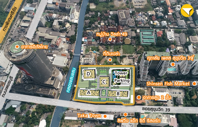 แผนที่แสดงสภาพแวดล้อมรอบๆ โครงการในระยะใกล้ ทิศเหนือ : ติดกับคลองแสนแสบ และถัดไปเป็นอาคารอิตัลไทยทาวเวอร์ ได้วิวฝั่งถนนเพชรบุรี ทิศตะวันออก : ติดกับชุมชนแนวราบ หมู่บ้านวิลล่า 49 และที่ดินเปล่า ทิศใต้ : ติดกับอาคารสูง 2 ชั้น ร้านอาหาร ถัดมาเป็นตลาดปลา Shinsen fish market และคอนโด Supalai place ฝั่งทิศตะวันตก : ติดกับถนนซอยสุขุมวิท 39 ฝั่งตรงข้ามเป็น Taka Town และสำหรับซอยสุขุมวิท 39 นี้ต้องบอกว่าถือเป็นอีกหนึ่งซอยที่มีร้านอาหารอร่อยๆ หลากหลายสไตล์ให้ได้เลือกทานกัน โดยเฉพาะอาหารญี่ปุ่น เราจะพาไปเดินสำรวจความอุดมสมบูรณ์ และบรรยากาศภายในซอยสุขุมวิท 39 กันค่ะ