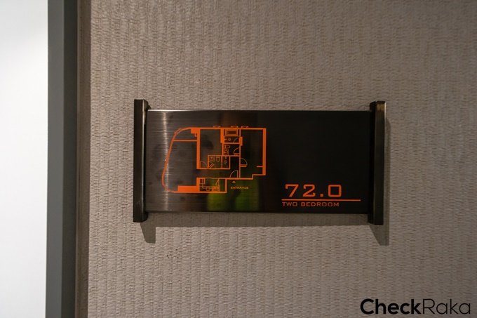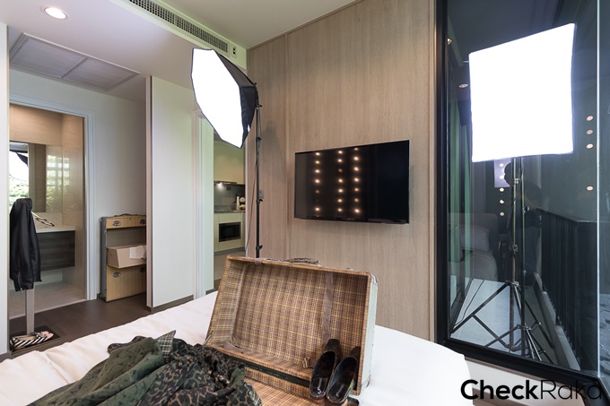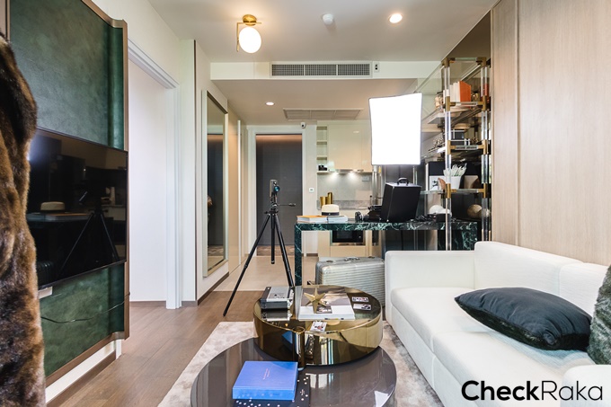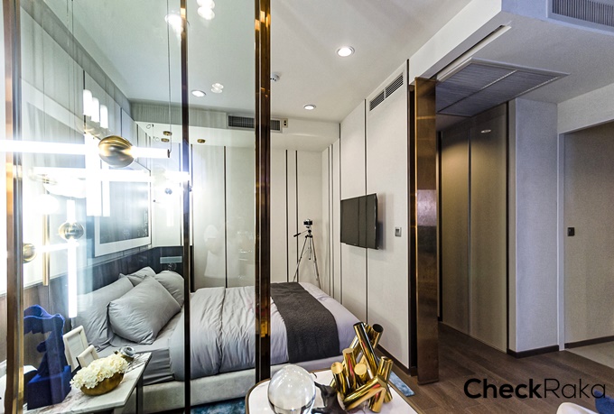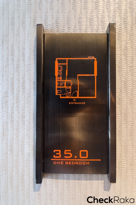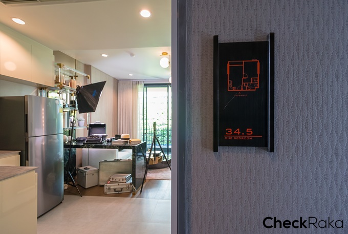 ที่สำนักงานขายจัดห้องตัวอย่างให้ได้ชมด้วยกันถึง 3 Type คือแบบ 1 Bedroom ขนาด 34.50 ตร.ม., แบบ 1 Bedroom ขนาด 35.00 ตร.ม. และแบบ 2 Bedrooms ขนาด 72.00 ตร.ม. เราจะพาไปชมกันทีละห้องค่ะ เริ่มจากห้องแรก