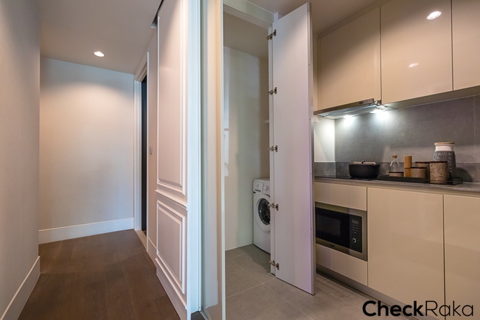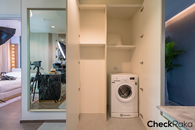 ฝั่งขวา หรือตรงข้ามกับครัว ทางโครงการ Built-in เป็นตู้บานเปิดสำหรับเก็บเครื่องซักผ้า ปิดมิดชิดเรียบร้อย
