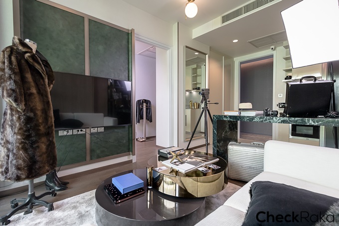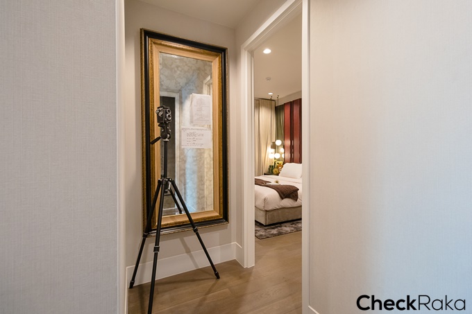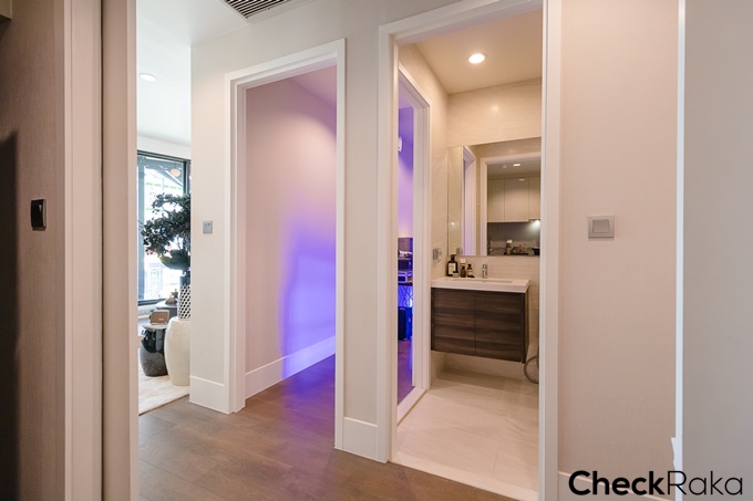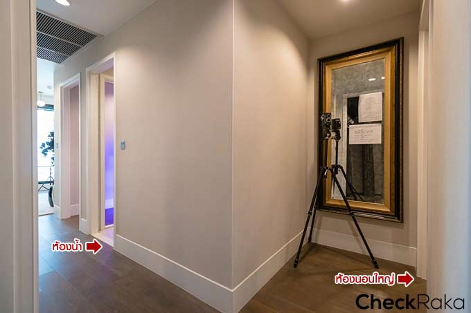 เข้ามาทางซ้ายจะเป็นห้องน้ำที่ 2 ห้องนอนที่ 2 ห้องครัว และห้องนั่งเล่น ส่วนทางขวาเป็นห้อง Master bedroom