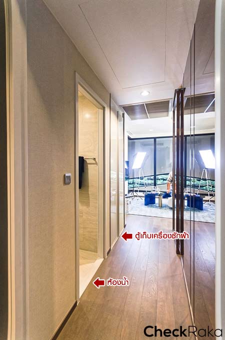 เข้าห้องมาทางซ้ายจะเป็นโซนของห้องน้ำ ติดกับห้องน้ำเป็นตู้สำหรับเก็บเครื่องซักผ้า