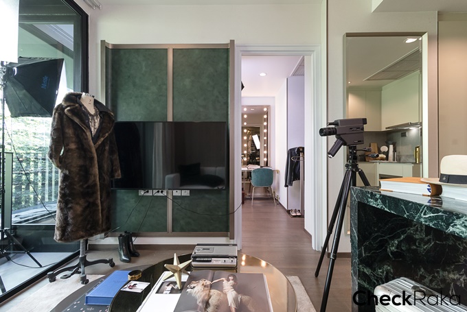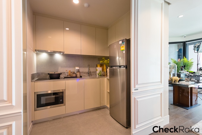 เข้ามาจะเจอกับโซนห้องครัวอยู่ทางซ้าย เป็นแบบครัวเปิดได้ชุดครัว Built-in รูปตัว L ตามแบบห้องตัวอย่าง