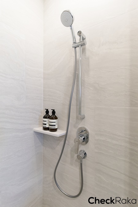 ผนังและพื้นห้องน้ำกรุด้วยกระเบื้องแกรนิตโต้ลายหินอ่อนแผ่นใหญ่ ทำความสะอาดง่าย