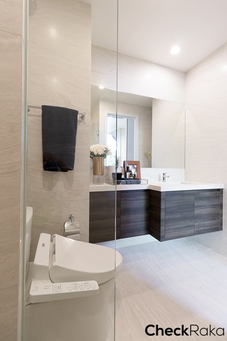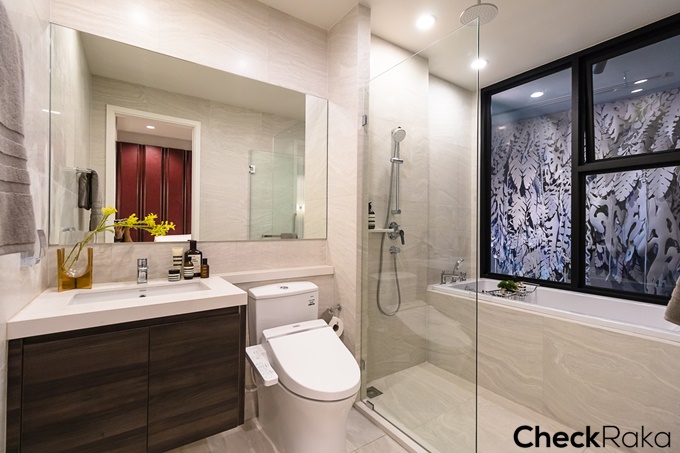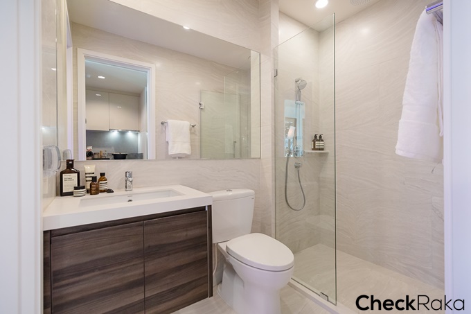 ยังคงได้ห้องน้ำขนาดใหญ่ กั้นแบ่งพื้นที่ใช้งานเป็นสัดส่วน ได้กระจกเงาบานใหญ่ และท๊อปอ่างล่างหน้า