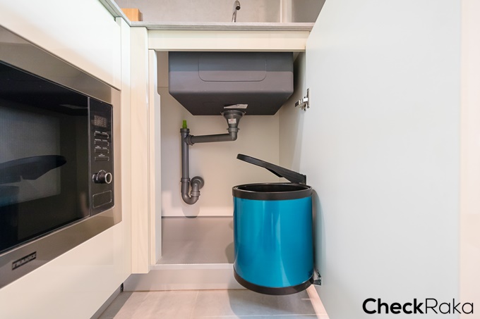 ติดตั้งถังขยะชนิดมีฝาปิดมาให้ที่ใต้ตู้ชั้นล่าง